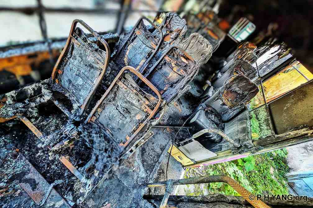 Charred minibus with gutted interior, shattered windows wuth exposed seat