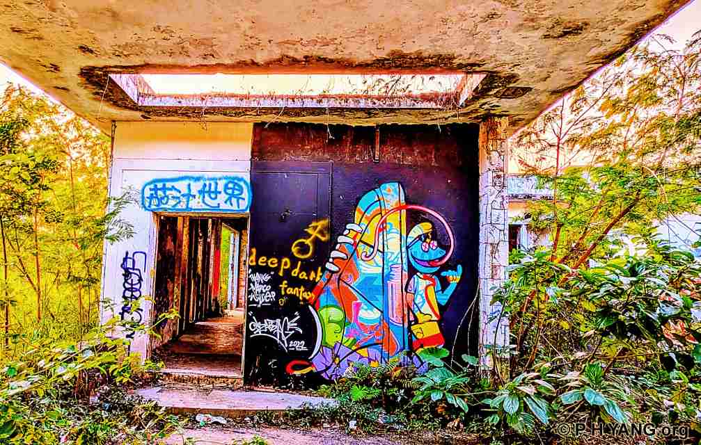 An abandoned Japanese garden, including a Torii gate, a bridge, some stone lanterns,