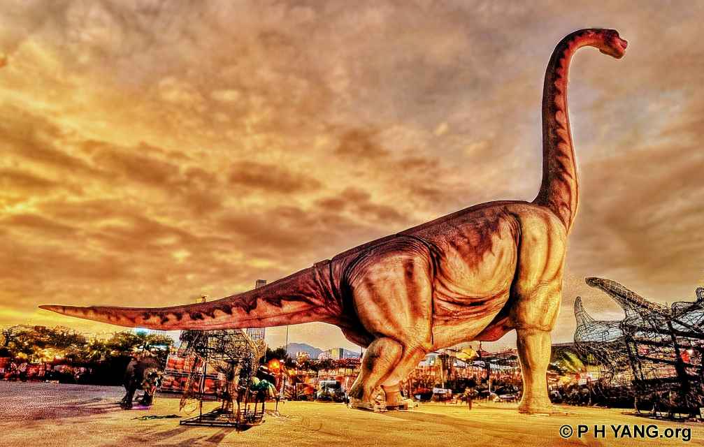 Dinosaurs, including a Brontosaurus, a Tyranosaurus, a Trisaratops,